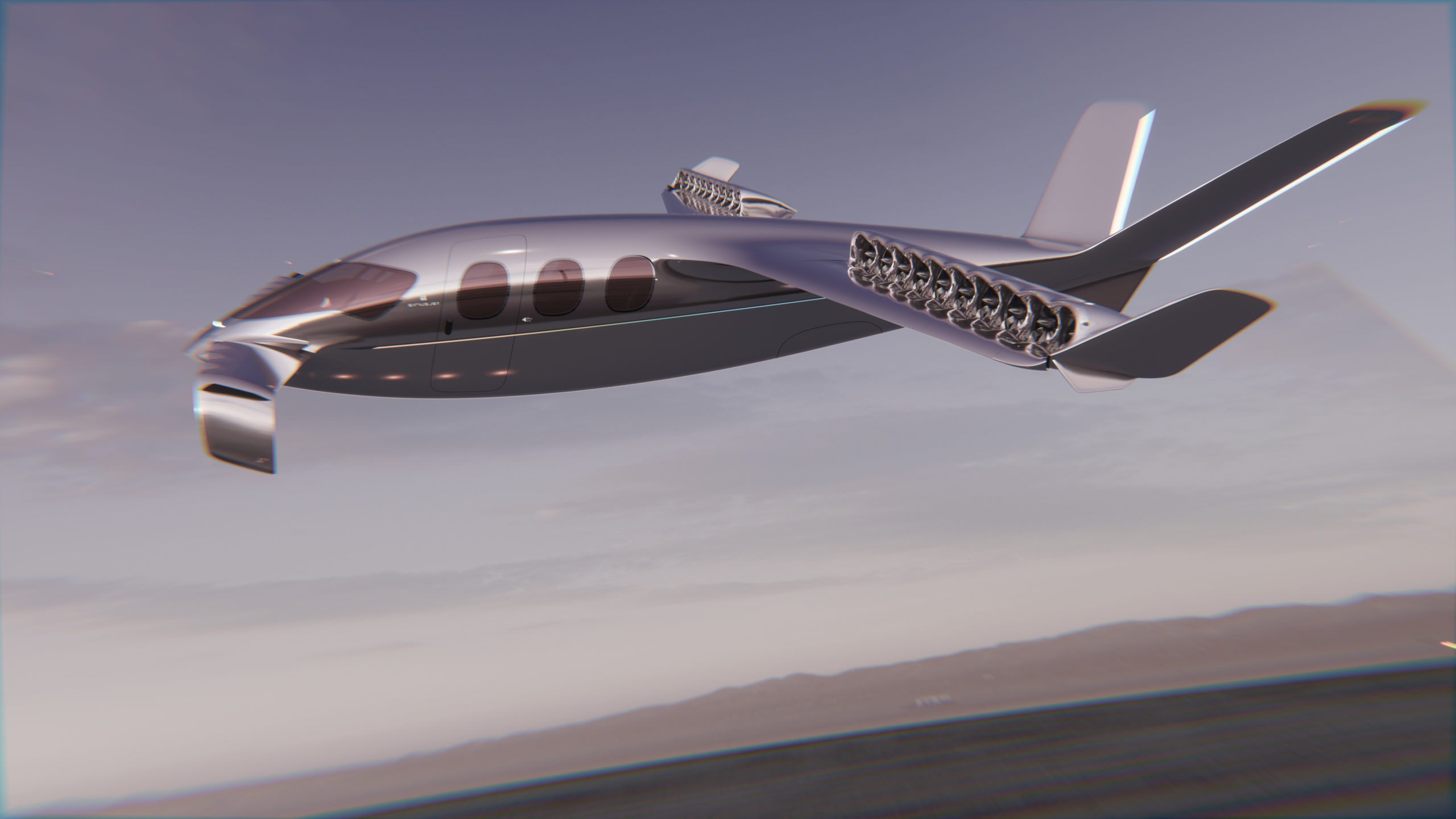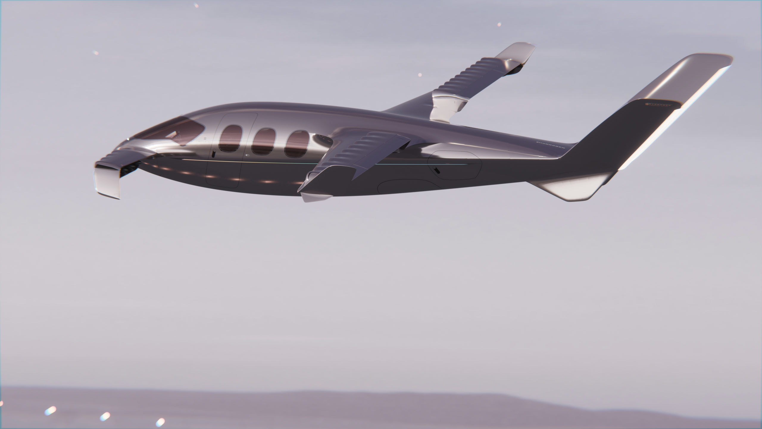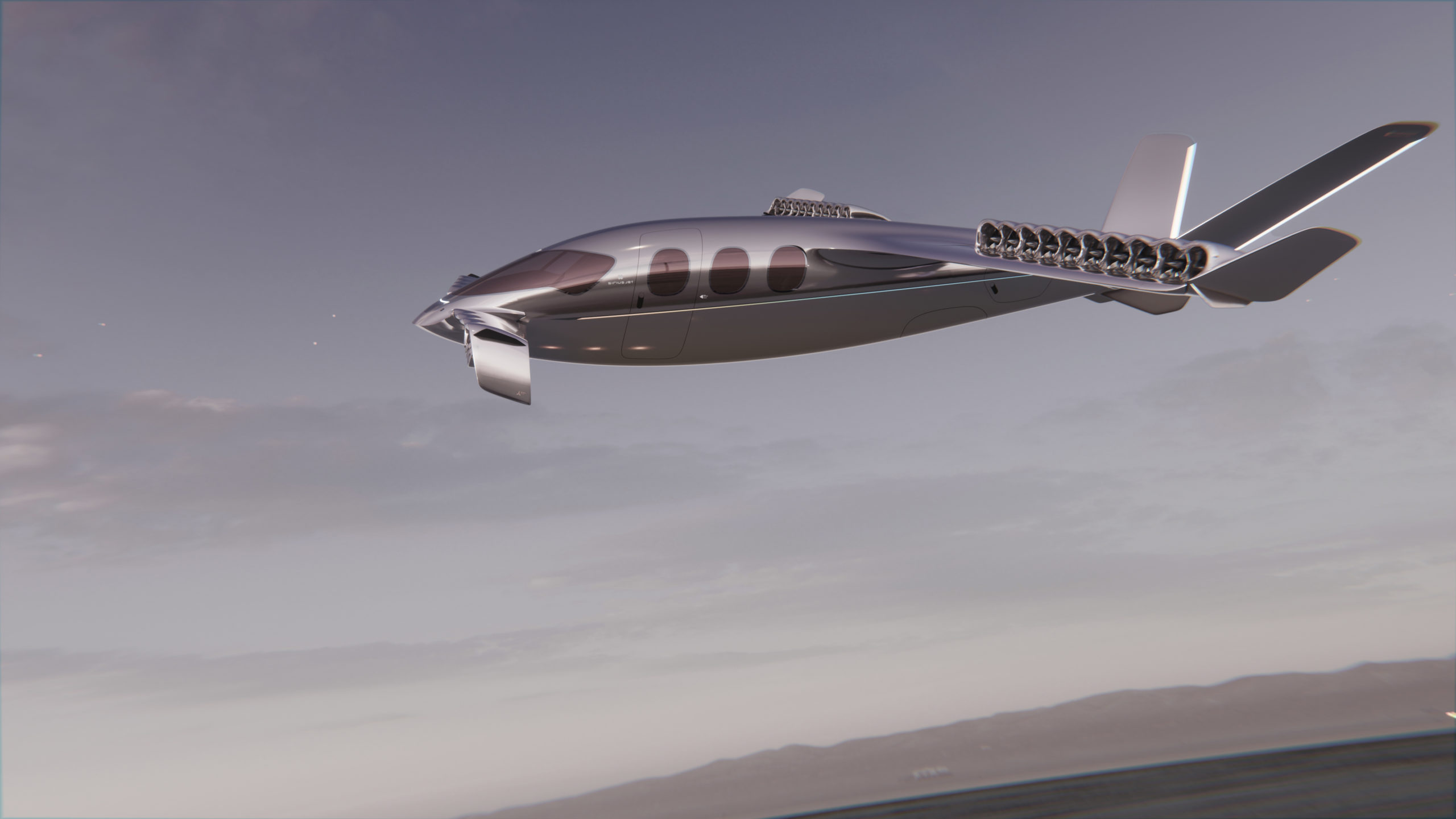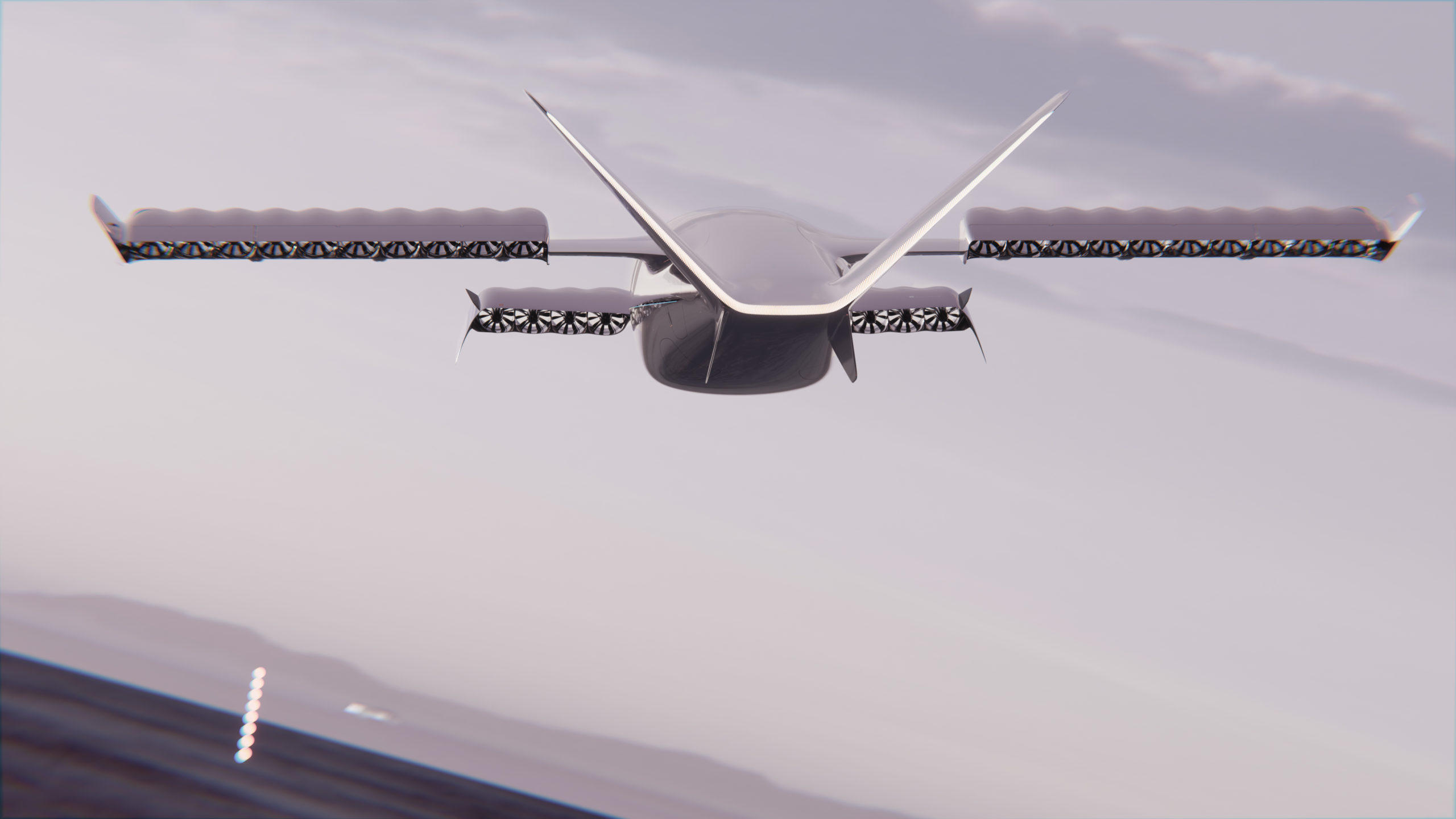 This type of propulsion system reduces noise emissions. 20 fans are located along the wings, 8 mounted in the canard. A separate electic motor drives each ducted fan.